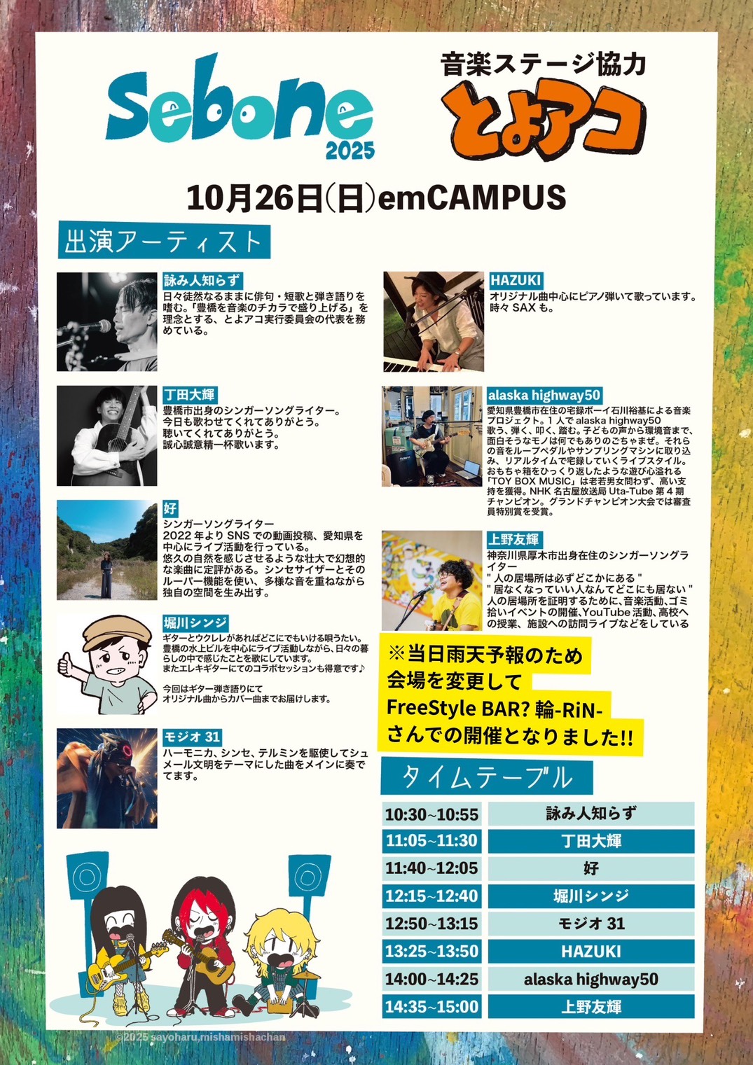 10月26日の雨天予報のため、会場が大豊ビルの『Free Style Bar 輪』(豊橋市駅前大通3丁目118 2F)となりましたので、ご注意ください。